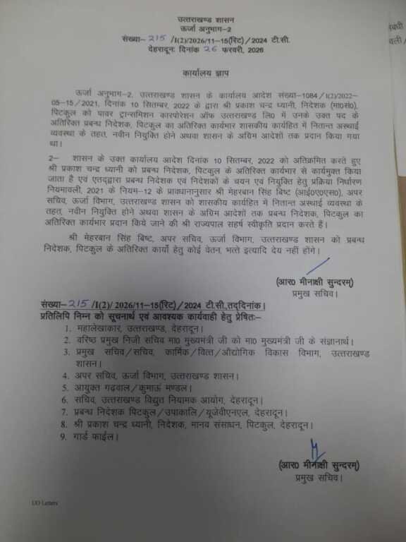 ऊर्जा अनुभाग-2. उत्तराखण्ड शासन के कार्यालय आदेश संख्या-1084/1(2)-2022-05-15/2021, दिनांक 10 सितम्बर, 2022 के द्वारा श्री प्रकाश चन्द्र ध्यानी, निदेशक (मा०सं०)....