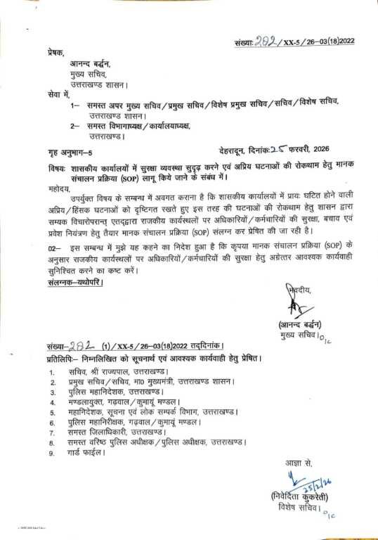 शासकीय कार्यालयों में सुरक्षा व्यवस्था सुदृढ़ करने एवं अप्रिय घटनाओं की रोकथाम हेतु मानक संचालन प्रक्रिया (SOP) जारी