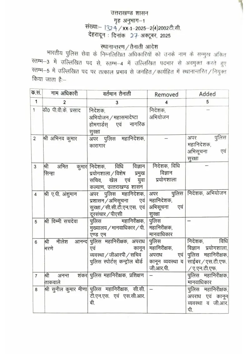 देहरादून: शासन से इस वक़्त बड़ी खबर सामने आ रही है। उत्तराखंड पुलिस विभाग में बड़े पैमाने पर तबादले किये गए है। शासन ने देर रात 16 आईपीएस और 8 पीपीएस अधिकारियों के तबादले आदेश जारी किए है।