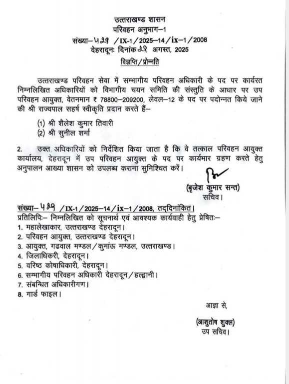 उत्तराखंड परिवहन विभाग में हाल ही में कई प्रशासनिक बदलाव किए गए हैं। सुनील शर्मा को संभागीय परिवहन अधिकारी (प्रशासन) से उप परिवहन आयुक्त पद पर पदोन्नत किया गया है। इसके अलावा, कई अन्य अधिकारियों के भी तबादले किए गए हैं: