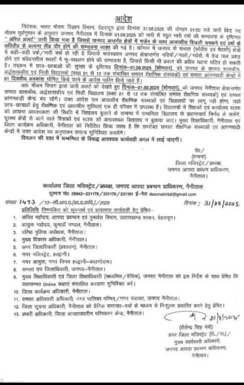 निदेशक, भारत भीसम विजञान किभाग, देहरादन दारा दिनांक 31.08.2025 की दोपहर 0100 बजेजारीकिएगए मीराम पूरवांुमान कें अनुरार जनपद नैनीताल मैं विनाक ०10202५ को भारी से यहुत भारी यां की रामावना केंद्षटिगत ऑरेर्ज अलरट” जारी किया गया है जिससे जनपद यनतर्गत सेत्रों गें गर्जन, के साथ आकाशीय बिजली चमकने एवंदषां के अतितीत से अत्यन्त तीव दौर होने की साावना वाक्त को गईं है। व्तंमान गैजनपद चों समर्त (पर्तीय एव मंदानी) सेत्रां में कही-कही व्ां मारी यषा हो रही है जिसके फलरयरूप जनमद सेत्रातर्गंत नदियों / नालों । गधेरों, मेंतेज जल प्रवाह होगे एवं सवेदनशील सथलों में मू-रखलन होने की राम्मावना ै, जिससे किरी भी प्रकार की अप्रिय घटना परित होंसाकती है। तद्कम में णत्र-णत्राओं की शुरसा कं दृटिंगत दिनांक-01092025_(सोमवार),_ को जनपट कें रारत शारापीय अद्धशाराचीय एवं निजी वियालयों (कदा 01 रो 12 तक रंचातित समरत रीअणिक रांस्थाओ) एव रामरत आंगनवाती केोन्डरोंगें 01 दिवरीय अवकारा पोपित किये जाने कें आदेश पारित किये जाते है।]
